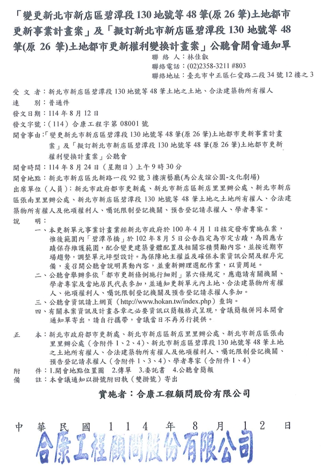 本案於08月24日09時30分召開「新北市新店區碧潭段130地號等48筆(原26筆)土地都更事業計畫案」及「擬定新北市新店區碧潭段130地號等48筆(原26筆)土地都市更新權利變換計畫案」公聽會,於新北市新店區北新路一段92號3樓演藝廳(馬公友宜公園-文化劇場)舉辦公聽會,並同辦理所有權人說明會。